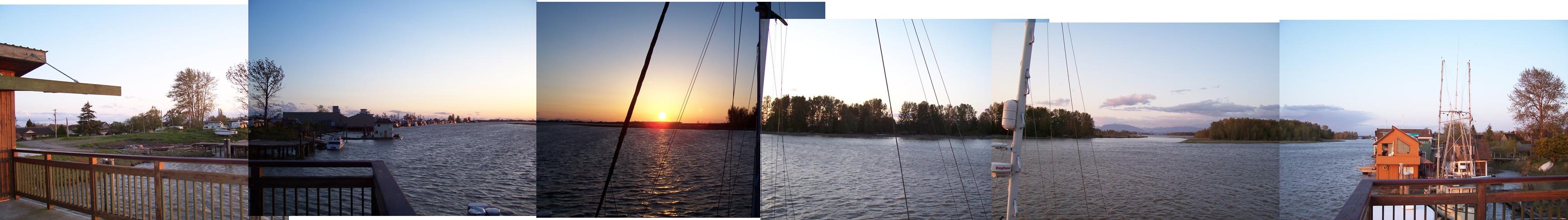 This panoramic series of photos was taken one after the other at sunset in late April, 2006 from the floathome's sundeck. The photos were connected together to form a panorama. Pan left to right using the horizontal scroll bar to get a complete view from the floathome's sundeck.